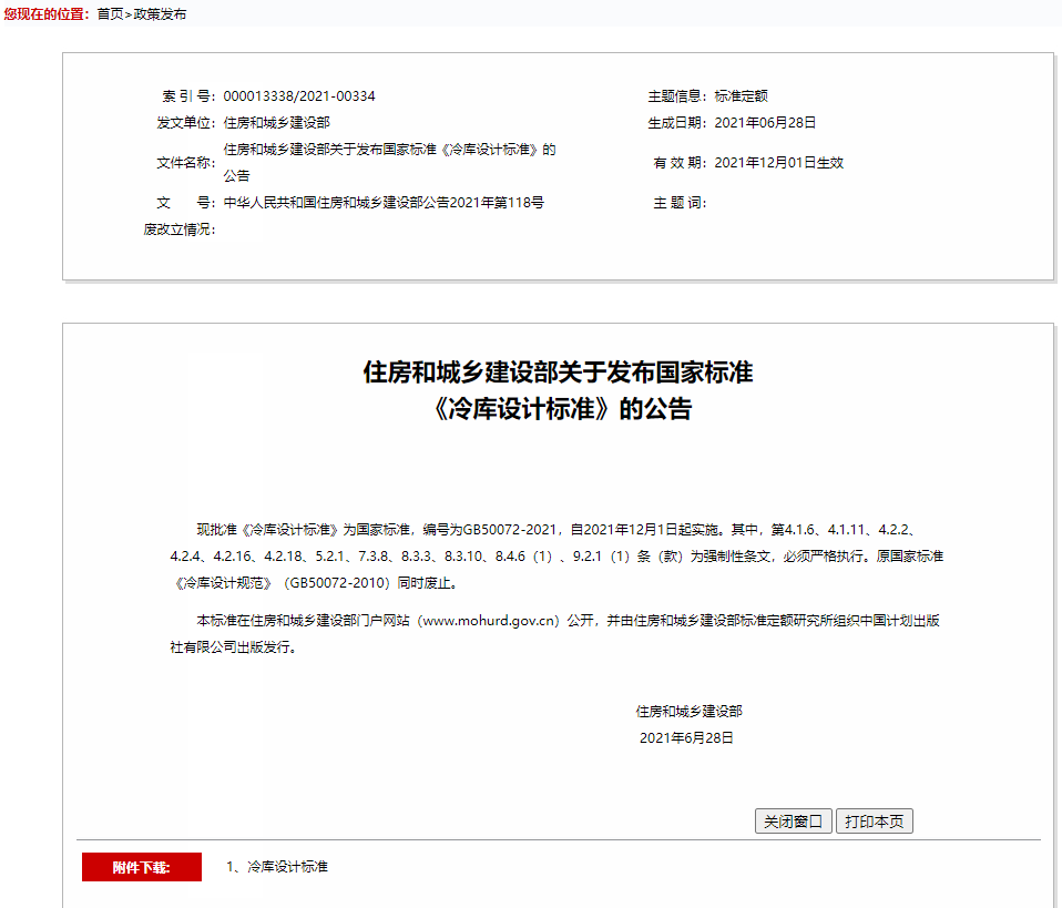 中华人民共和国住房和城乡建设部关于发布国家标准《冷库设计标准》公告