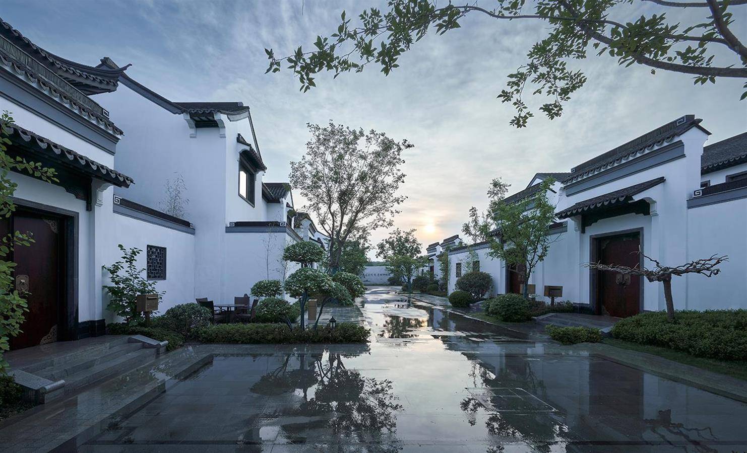 东方美学的“气韵”是缥缈且难以物化的,因此设计继承并优化了传统山院的形制,将借景、对景等传统造园手法融入项目的中式合院区,通过漏窗、月洞门、门廊等使被分隔的空间发生渗透,以形成分而不隔、穷而不尽的视觉体验。鸟瞰整个园区,如同一幅疏密相间、张弛有度的水墨丹青,缱绻地将环境纳入麾下,赋予场地轻盈的流动感与鲜活的生命力。
